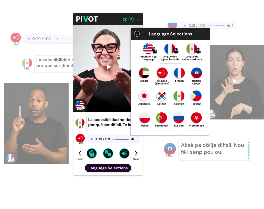PIVOT delivers signed language video, spoken audio, and written text translations in one unified experience, without duplicating content, creating separate pages, or sending users elsewhere.
